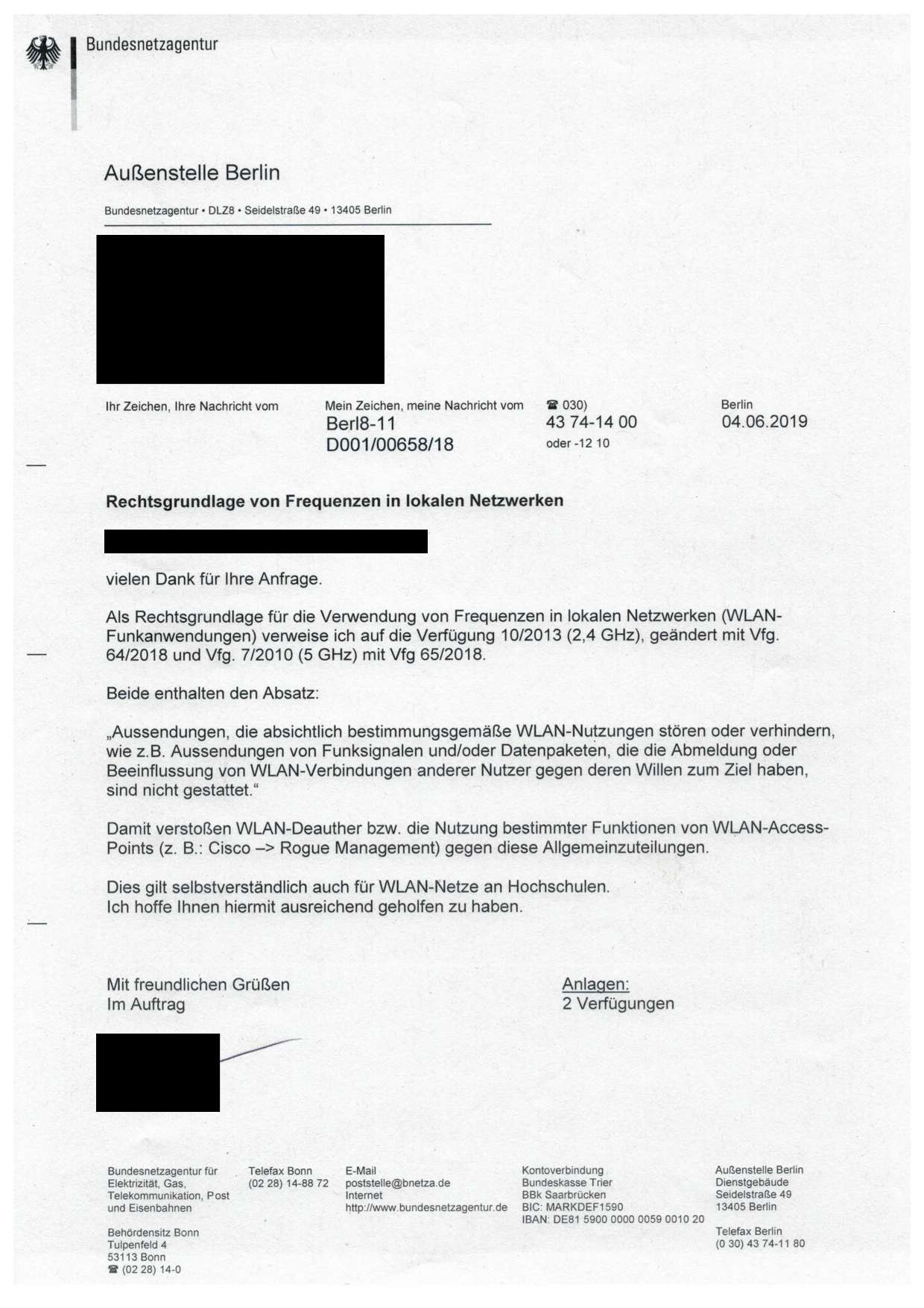 | yes: The university sends out deauthentication transmissions to all other WLANs (this includes measures of last resort). yes*: The university refused to provide this information. Deauthentication transmissions to other WLANs are probably taking place by the university. | strict: There are additional rules for the use of WLANs in the university that require a permit. strict*: The university refused to provide this information. There are probably additional rules for the use of WLANs in the university that require a permit. |